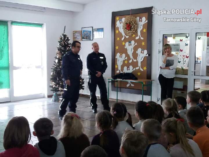 Dzielnicowi z Tworoga asp. szt. Andrzej Musik oraz mł. asp. Maciej Bobola rozmawiali z dziećmi o bezpieczeństwie podczas ferii zimowych. Stróże prawa przedstawili zasady bezpiecznego spędzania czasu wolnego. Podczas pogadanki uświadamiali uczniów jak bardzo niebezpieczna jest zabawa na zamarzniętych akwenach wodnych i zachęcali do korzystania ze zorganizowanych lodowisk. Policjant omówił również zasady bezpiecznego poruszania się po drogach, kładąc szczególny nacisk na noszenie odblasków. Najmłodsi czynnie uczestniczyli w zajęciach.