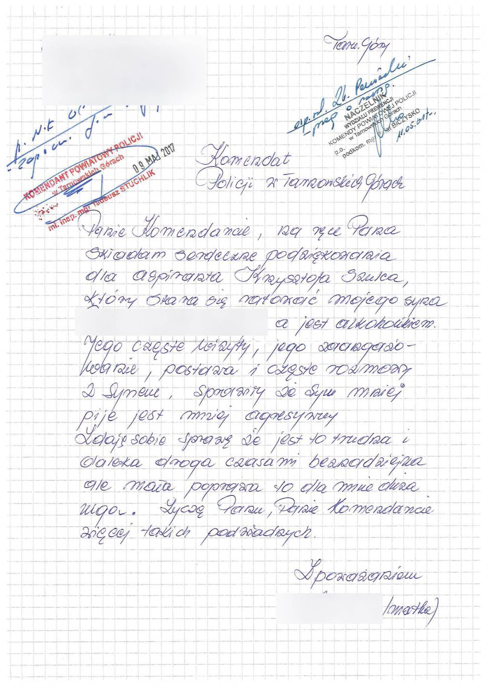 Na ręce Komendanta Powiatowego Policji w Tarnowskich Górach mł. insp. Tadeusza Stuchlika wpłynęły podziękowania dla dzielnicowego. Tarnogórzanka podziękowała asp. szt. Krzysztofowi Szulcowi za zaangażowanie i pomoc w ratowaniu syna, który nadużywa alkoholu.