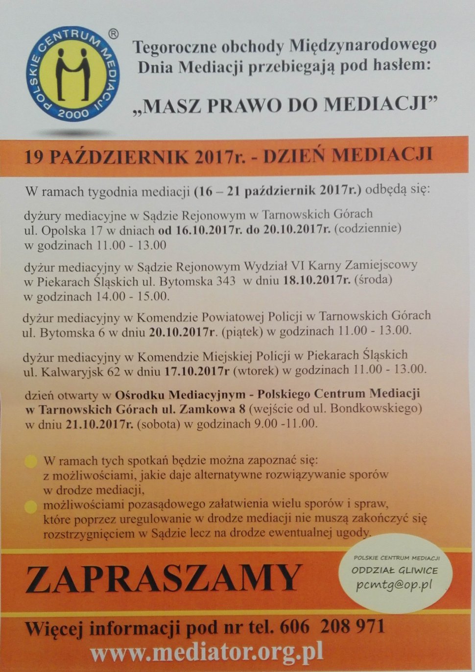 Tydzień Mediacji oraz Międzynarodowy Dzień Mediacji to inicjatywa, która ma na celu upowszechnienie idei mediacji jako narzędzia rozwiązywania konfliktów na gruncie karnym. W działania włączyli się również tarnogórscy policjanci, którzy współpracują z placówkami, które pomagają w rozwoju polubownych metod rozwiązywania sporów i prawa do mediacji. Przez cały tydzień w tarnogórskim sądzie, a 20 października bieżącego roku również w tarnogórskiej komendzie, będą udzielane bezpłatne porady mediatorów.