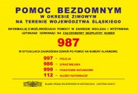 1 listopada br. w Wojewódzkim Centrum Zarządzania Kryzysowego ruszyła bezpłatna infolinia dla osób bezdomnych o numerze telefonu 987 (połączenia bezpłatne zarówno z telefonów komórkowych, jak i stacjonarnych), pod którym można uzyskać informację o możliwości pomocy w zakresie noclegu i wyżywienia. Infolinia będzie funkcjonować całodobowo, w każdym dniu tygodnia i obejmować swym zasięgiem teren województwa śląskiego.