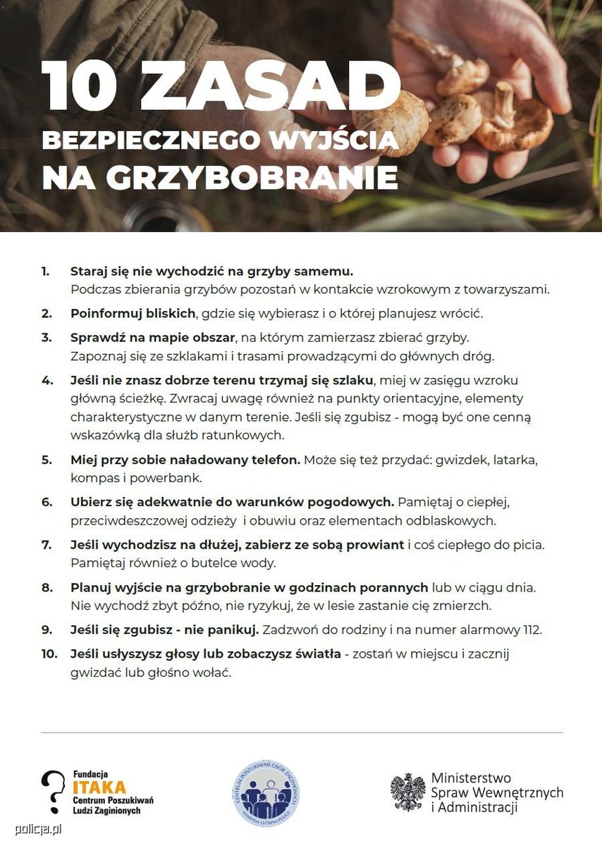 Fundacja ITAKA - Centrum Poszukiwań Ludzi Zaginionych razem z Centrum Poszukiwań Osób Zaginionych Komendy Głównej Policji oddaje w Państwa ręce ulotkę dotyczącą bezpieczeństwa seniorów podczas grzybobrania - „10 zasad bezpiecznego wyjścia na grzybobranie”. Ulotka jest przygotowana w formacie A4, można ją wydrukować i powiesić w widocznym miejscu. Działanie jest realizowane w ramach projektu zleconego Fundacji ITAKA – Centrum Poszukiwań Ludzi Zaginionych przez Ministra Spraw Wewnętrznych i Administracji.