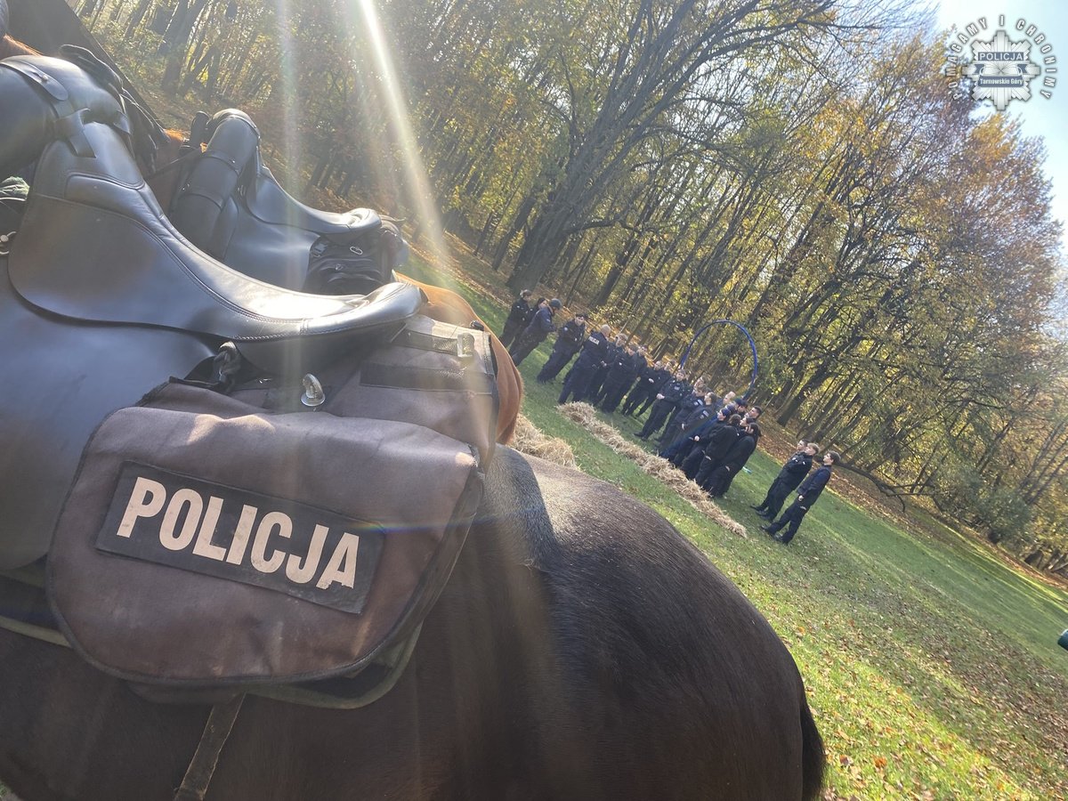 Pokaz policyjnych umiejętności jeździeckich dla uczniów klasy policyjnej