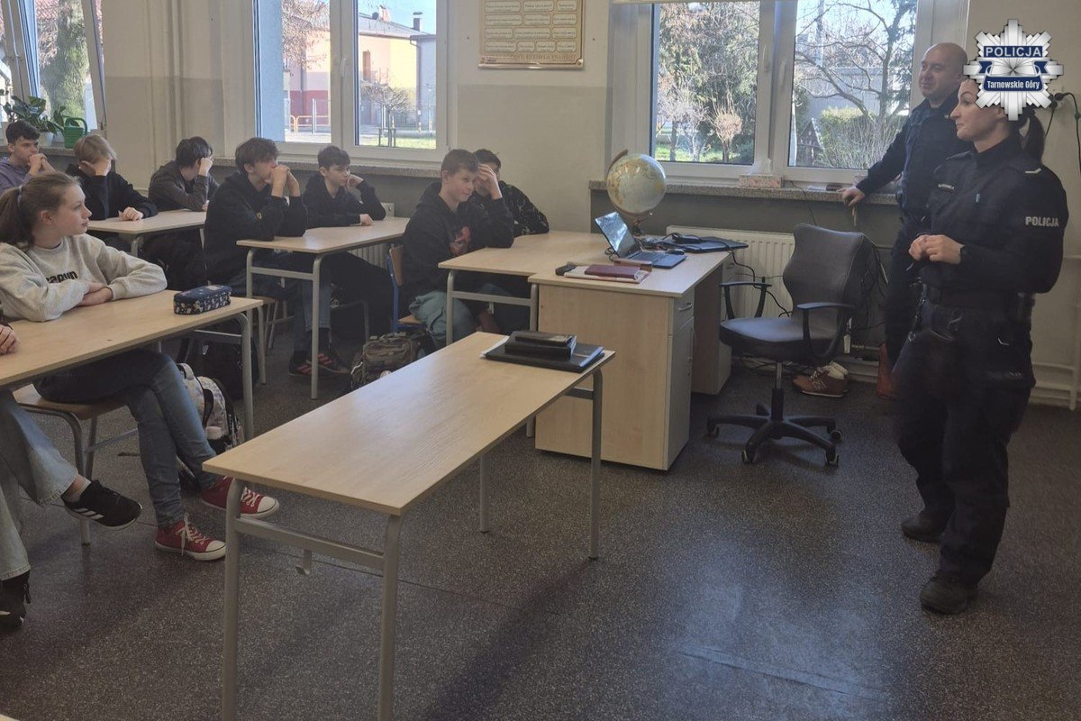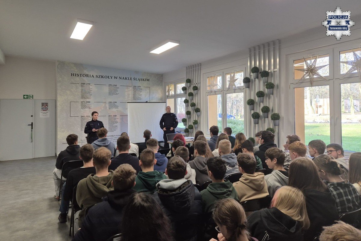 Sierżant Mariola Piotrowska i podkomisarz Sebastian Golicz odwiedzili wczoraj uczniów ze szkoły podstawowej i Zespołu Szkół Centrum Kształcenia Rolniczego w Nakle Śląskim gdzie poruszyli tematy, które mają duży wpływ na ich bezpieczeństwo.