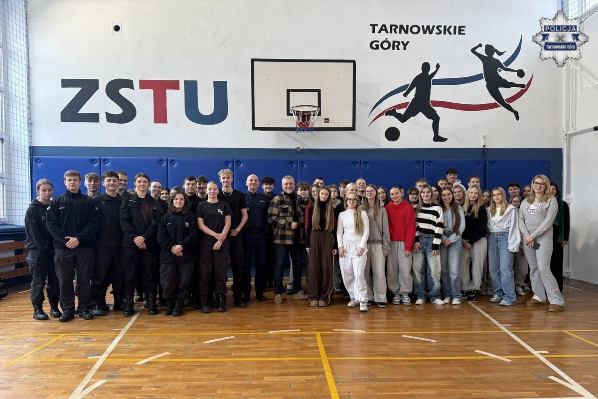 Tuż przed południem w sali gimnastycznej tarnogórskiej „kolejówki” zebrali się uczniowie klas policyjnych, na których czekał pewien znany gość. Tarnogórski profilaktyk podkom. Norbert Ucieklak zaprosił na spotkanie z uczniami znanego i lubianego aktora - Sebastiana Wątrobę.