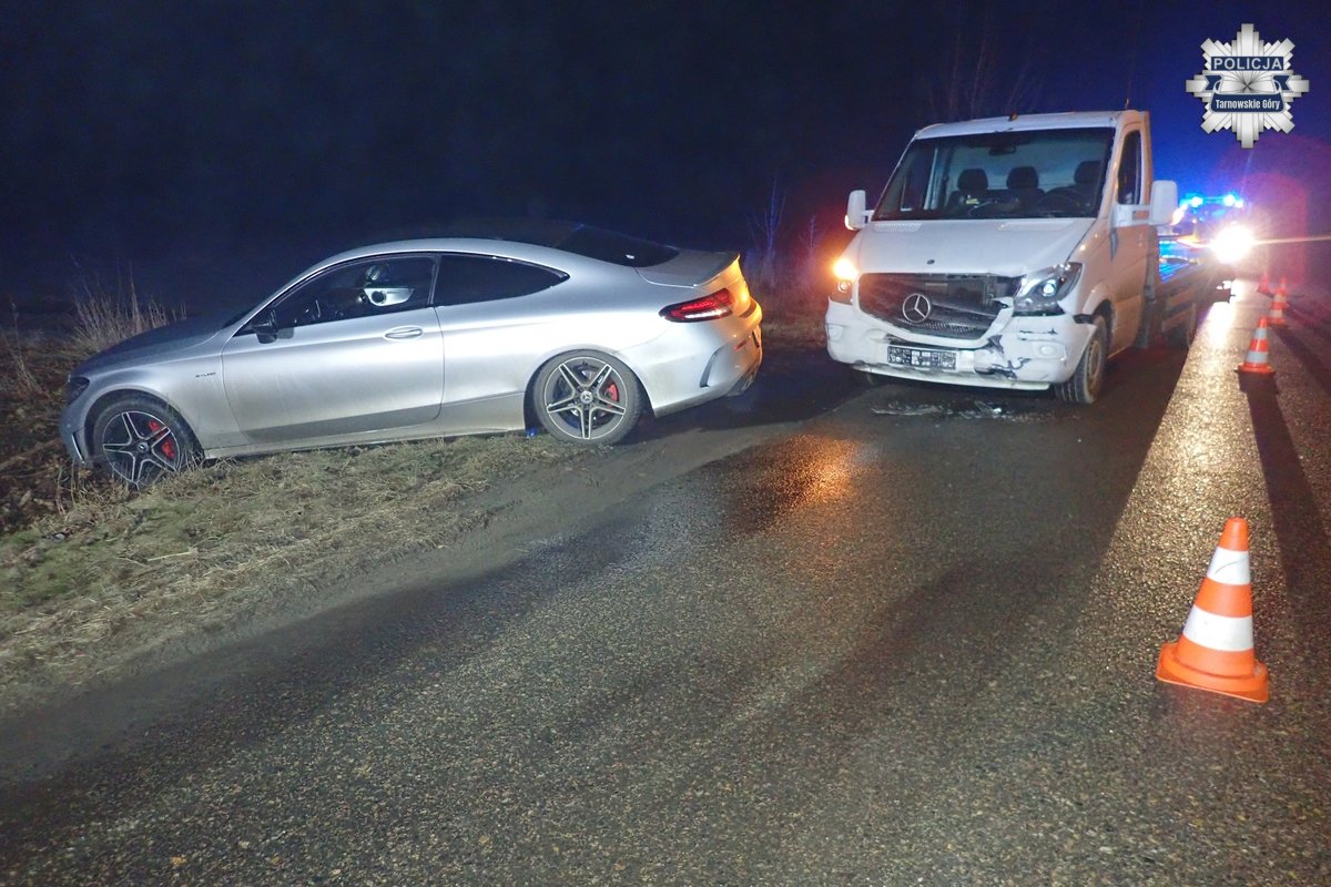 Do zdarzenia doszło około 22.00 w Wieszowie na skrzyżowaniu ulicy Moniuszki z Mickiewicza. Pracujący na miejscu zdarzenia policjanci ustalili, że 48-latek za kierownicą osobowego mercedesa nie udzielił pierwszeństwa przejazdu 32-latkowi, który jechał ciężarowym mercedesem.