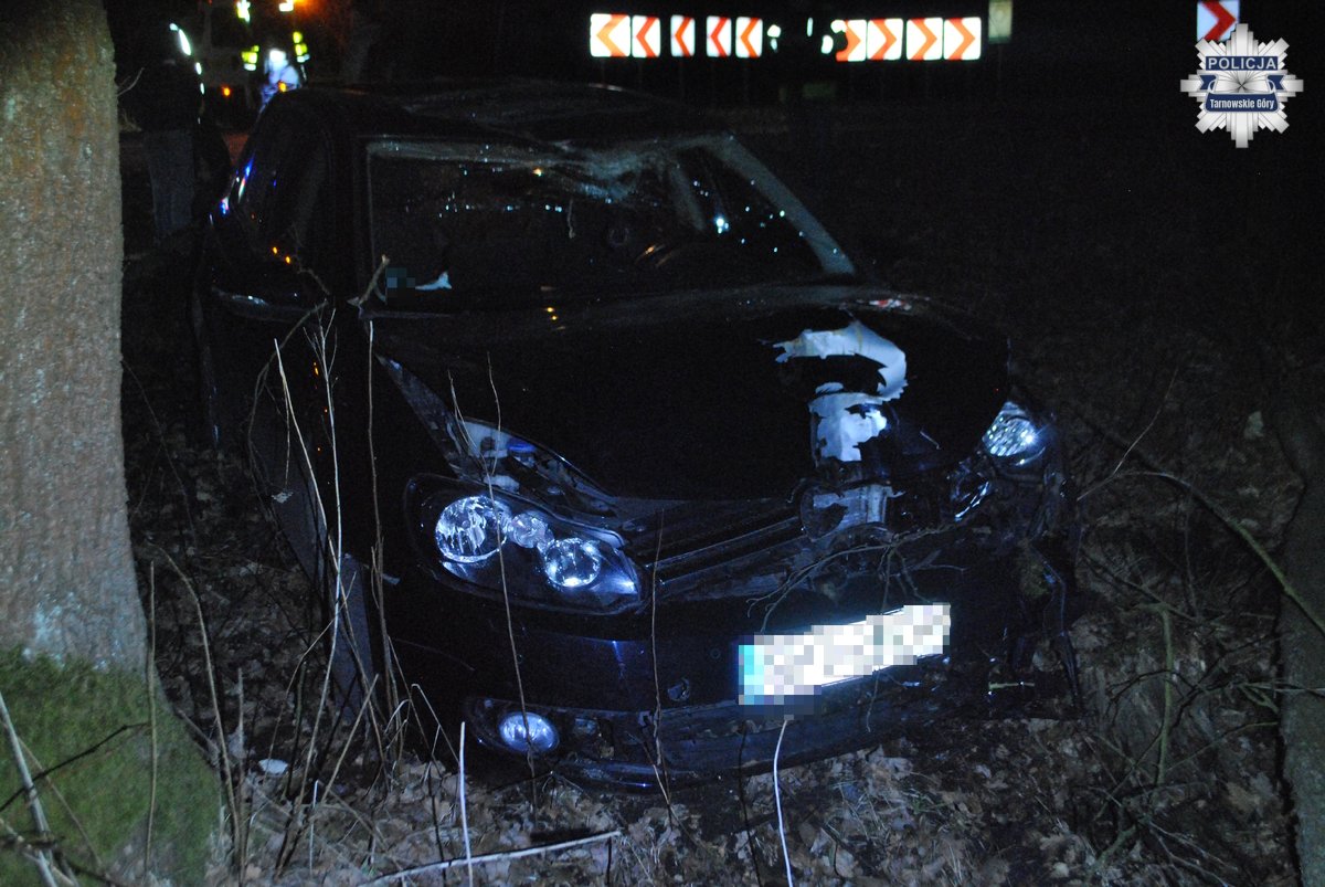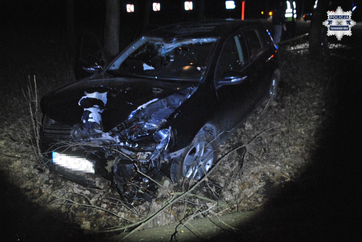 Do zdarzenia doszło chwilę po godzinie 19.00 na DW912 pomiędzy Miasteczkiem Śląskim a Świerklańcem. Pracujący na miejscu zdarzenia policjanci ustalili, że 18-letni mieszkaniec Piekar Śląskich, jadąc swoim Volkswagenem z nadmierną prędkością od strony Żyglinka, zjechał z jedni i pojechał na skrzyżowaniu na wprost, kończąc podróż na przydrożnym drzewie.